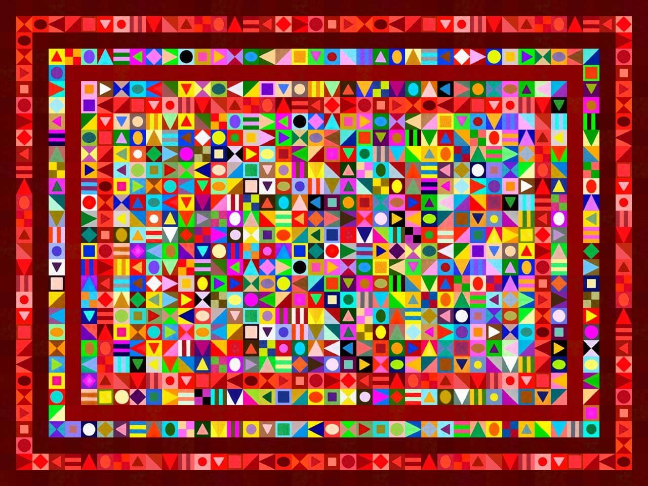 Composição abstrata formada por 1200 peças pintadas digitalmente. O conjunto das peças forma o tapete. Contém uma variedade de cores.