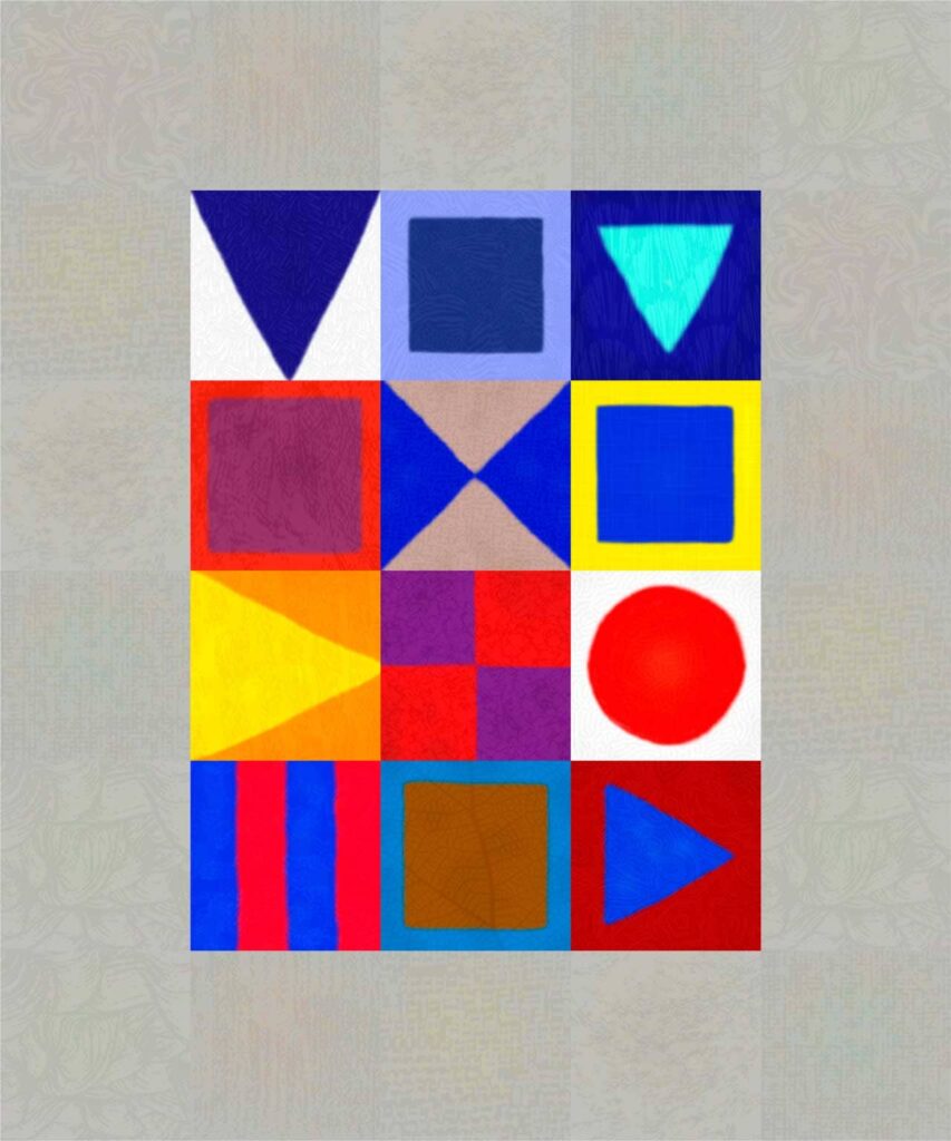 Composição abstrata formada por 30 peças pintadas digitalmente. O conjunto das peças forma a colcha. Contém uma variedade de cores.