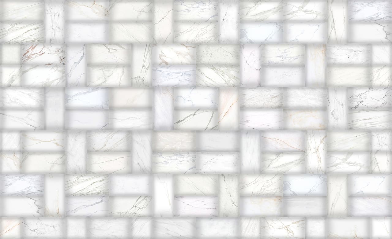Composição abstrata formada por 106 peças feitas a partir de imagens de superfícies de mármore e granito digitalmente tratadas e cortadas. O conjunto das peças forma a calçada. Peças cortadas nos tamanhos 3 x 6 cm e 3 x 3 cm. Na cor branca.