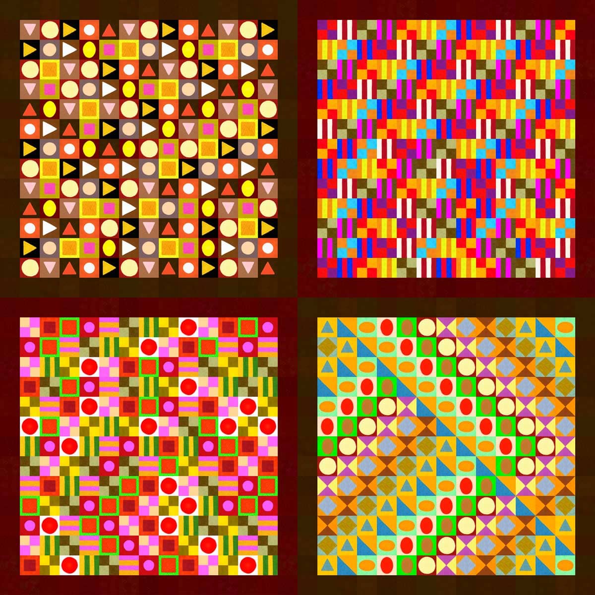 Composição abstrata formada por 900 peças pintadas digitalmente. O conjunto das peças forma a tapeçaria. Contém uma variedade de cores.