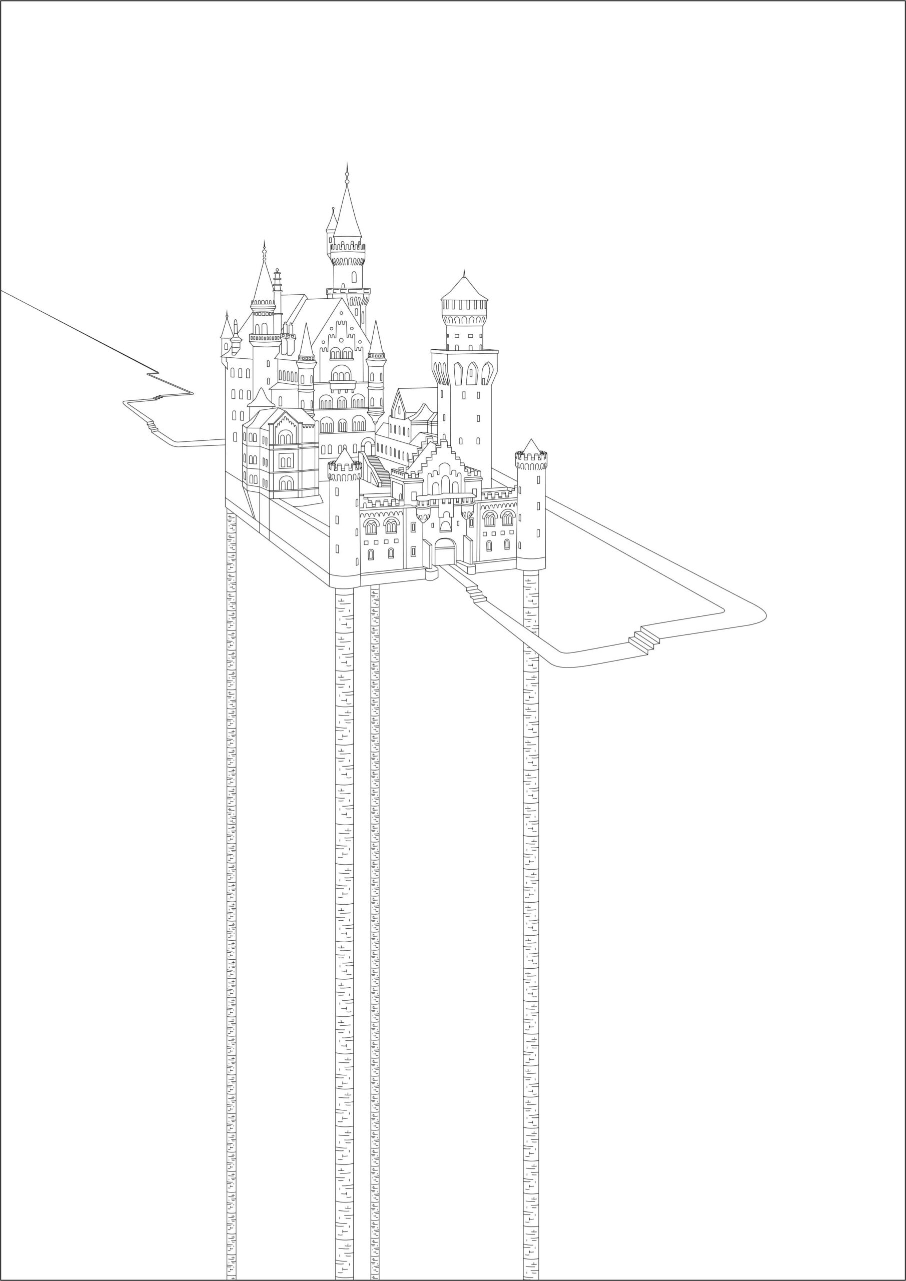 Desenho feito com o Corel Draw usando somente linhas. Baseado no Castelo de Neuschwanstein, Alemanha. Em preto e branco.